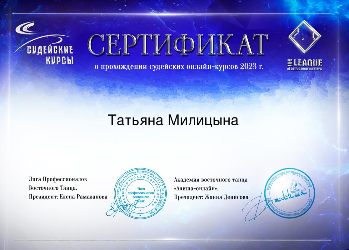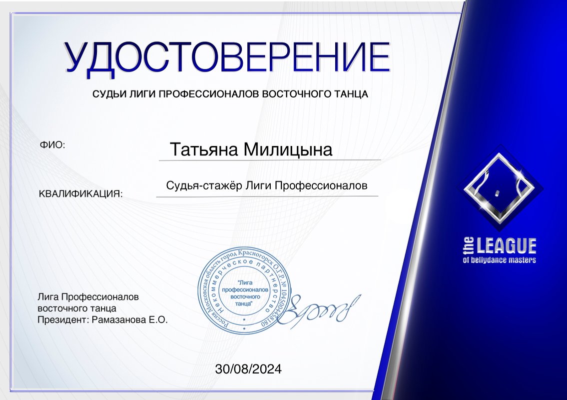 Профессиональная танцовщица, судья и педагог Лиги профессионалов восточного танца, организатор мероприятий, хореограф-постановщик, многократный победитель международных конкурсов по восточному танцу в России и за рубежом
