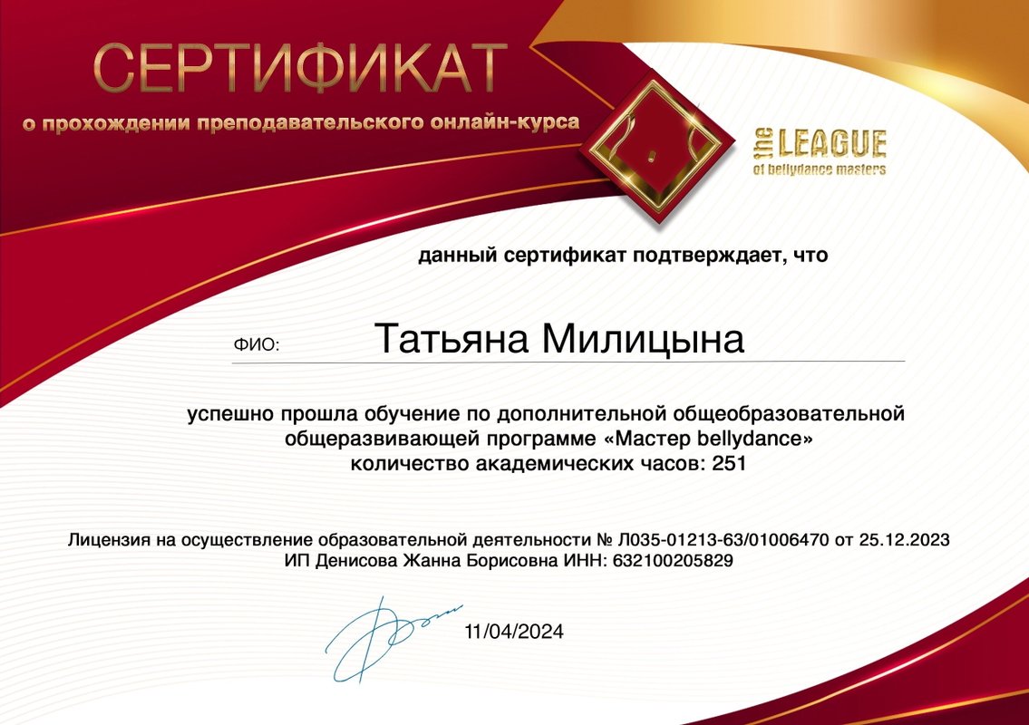 Студию танцев посещаю с большим удовольствием, так как люблю восточные танцы. Именно здесь сочетается дисциплина с красотой и подпитывается качественными знаниями. Благодарю Татьяну за то, что продолжает популяризировать ориентальный танец в нашем прекрасном городе.